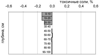 - При прекращении в 1991 г. орошения остающихся в сельскохозяйственном обороте слабозасоленных в пахотном горизонте почв, на фоне слабой дренированности территории к 2005 г. уровень грунтовых вод понизился на 1,0-1,5 м, наметилась тенденция снижения содержания токсичных солей в 0-30 см слое с 0,162?0,196% до 0,044?0,029% и произошло значительное перераспределение ионов по почвенному профилю, вследствие которого наибольшая их концентрация сместилась из пахотного горизонта во второй полуметр.