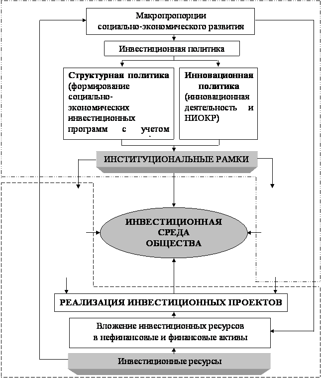 Инвестиционный процесс в экономике любого типа предполагает осуществление цепочки метаморфоз: ресурсы > вложения > прирост капитала > полезный эффект. Это реализуется в инвестиционной деятельности в определенный временной промежуток через установление целей инвестирования и механизмов их достижения. При этом под целями понимается обоснование оптимальных объемов и пропорций инвестиционных вложений в отрасли и сферы экономики. Экономические же механизмы представляют собой тот инвестиционный институт, посредством которого формируются указанные объемы и пропорции. Исходя из сказанного, для инвестиционного процесса характерен дуализм функций. С одной стороны, инвестиции служат средством формирования оптимальных пропорций общественного воспроизводства и являются компонентой инвестиционной деятельности, с другой, они создают институт формирования оптимальных пропорций общественного развития и являются элементом условий аих реализации.