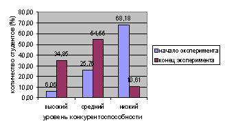 Результаты констатирующего эксперимента позволили сделать следующие выводы: 1) существует осознание необходимости и потребность в развитии конкурентоспособности студентов среди самих студентов, выпускников, преподавателей и работодателей; 2) преобладающая традиционная подготовка не способна эффективно развивать конкурентоспособность студентов; 3) эффективное развитие конкурентоспособности студентов может быть обеспечено путем разработки структурно-функциональной модели данного процесса и ее реализации на основе контекстно-модульного подхода при внедрении комплекса педагогических условий.