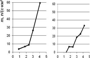 Зональный сток в годы с различной водностью. Для понимания механизма формирования стока важно исследовать различия значений зонального стока в годы с различной водностью. Исследование проводилось для трех выделенных однородных гидрологических районов бассейна Амударьи, лучше всего освещенных данными ежегодных наблюдений за стоком: районов 1, 2, 4. Для каждого из этих трех районов обратная задача о зональном стоке решалась для многоводного (1969) и маловодного (1974) года для среднегодовых значений (рис. 3).
