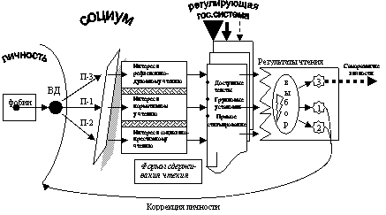 Поскольку чтение является одним из эффективных способов освоения социального опыта прошлых поколений, социум всегда поддерживает определенный минимально необходимый для его существования уровень развития этой коммуникации. Но, так как интерес к рефлексивно-духовному чтению носит независимый от социума характер, провоцируя скорее развитие девиаций, а не стабилизацию нормативных структур, и его реализация формирует оппозиционную социуму личность, общество стремится сдерживать и контролировать развитие этого и примыкающих к нему видов чтения. Подобная система сдерживания формируется и действует в любой общественной системе, причем для самоорганизации жизни социума в целом достаточным условием было бы наличие стихийно возникающих регулирующих форм. Но потенциальная угроза государственности предопределяет оформление со стороны государства управленческих воздействий на эти формы, укрепляющих защитные механизмы его самосохранения. Такие управленческие воздействия имеют многоуровневую структуру и складываются в репрессивно-регулирующую государственную систему. Различные виды интереса к чтению, проходя через систему государственного сдерживания, либо угасают, либо реализуются в трех основных видах чтения: нормативном, престижном, свободном. При этом результатом нормативного чтения становится освоение индивидом базовых инвариантных социальных стереотипов, результатом престижного чтения - освоение вариативных групповых стереотипов, что в целом на затрагивает глубинных основ личности и ведет лишь к ее коррекции (приращению знаний, навыков социального взаимодействия, новых эмоций). Результатом же свободного, рефлексивно-духовного чтения становится деконструкция социальных стереотипов, ведущая к переосмыслению, переоценке основ собственного существования, к независимому самостоятельному выбору дальнейших жизненных сценариев, и, следовательно, к саморазвитию личности. На основе предложенной модели, в чтении как коммуникативном процессе автором выделяется несколько фаз, ведущих к кульминационной точке развития личности, становления независимого от социальных ролей, самодостаточного, единичного индивида, осознанно делающего свой выбор в любой ситуации.