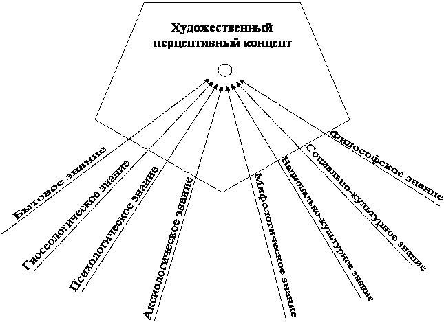 Рассмотренные виды знаний формируют содержание интерпретационного поля художественного перцептивного концепта, его основные когнитивные признаки (см. схема 10), семантическая объективация которых аобусловливают выход перцепции за рамки собственно эмпирического знания.
