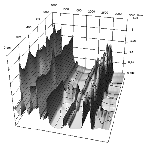 В результате измерения ИК-спектра модельных систем были получены трехмерные контурные графики изменения величины пропускания характеристических пиков в зависимости от расстояния от границы раздела фаз клей-субстрат при разном времени контакта (рисунки 8-15).