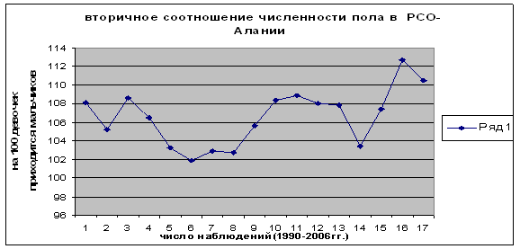 Проведены исследования в области вторичного соотношения численности пола на локальном уровне (в КБР, КЧР и РСО - Алания). Постоянное превышение числа рождений мальчикова над числом рождений девочека было одной из первых, эмпирически установленных демографических закономерностей, которая обратилаа на себя внимание ещё в XVII-XVIII вв. и была описана Дж.Граунтом, затем И.П.Зюсмильхом и др. Позднее вторичное соотношение исследовали многие ученые. В России это явление упоминается в работе Д.Бернулли, а также Л.Ю.Крафта, в XIX- начале XX вв. изучением вторичного занимались Ю.Э.Янсон, А.А.Чупров, Б.Ц.Урланис, Л.П.Кочеткова и др. Было доказано, что преобладание мальчиков среди новорожденных закономерно, а колебания этого соотношения от года к году и между странами обусловлены в основном случайными причинами. С развитием демографической статистики вторичное соотношение полов было изучено в разных возрастах и группах и была обнаружена зависимость от очередности рождения, брачного состояния матери и возраста родителей. Установлено, что вторичное повышается во время войн и в первые годы после них. Влияние войны на половой состав рождающихся довольно глубоко и всесторонне исследовано С.А.Новосельским. Феномен вторичного соотношения полов исследуется и в настоящее время многими учеными демографами, биологами, медиками и др. В 1958 г. армянский исследователь В.Камалян, выдвинул гипотезу, что повышение половой пропорции есть отклик на неблагоприятные условия. Во время больших природных или социальных сдвигов (резкие изменения климата, засуха, война, голод, переселение) наблюдается тенденция повышения вторичного соотношения полов - растет процент мальчиков.а В Закавказье с начала 1990-х гг. (конфликт Армении и Азербайджана по поводу Нагорного Карабаха, грузино-абхазский конфликт) отмечается рост рождаемости мальчиков. Колебания вторичного соотношения полов в пределах 116-119 характерны для всего Южно-Кавказского региона. В этом плане нами приведены исследования в области вторичного соотношения численности пола в республиках Северного Кавказа: в Кабардино-Балкарской Республике, в Карачаево-Черкесской Республике и в Республике Северная Осетия-Алания за 1990-2002 гг. Выявлено повышение вторичного соотношения численности пола во всех аисследуемых республиках в период экономического кризиса (рис. 1,2.); проведена корреляционная зависимость от очередности рождений, от возраста матери от состояния матери в браке.