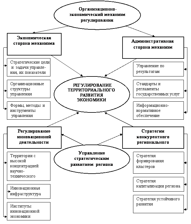 Формирование организационно-экономического механизмаа регулированияа развития регионаа заключается в трансформации блоков системы управления региона, в том числе государственного, включая его экономическую и аадминистративную стороны. Экономическая сторона механизма регионального управления включает совокупность целевых показателей,а Административная сторона механизма регулирования региональной экономикиаа в свою очередь, помимо совокупности институтов государственного управления, включает такие норм хозяйственного права, как лицензирование отдельных видов деятельности, арбитражное и корпоративное правоа и т.д.