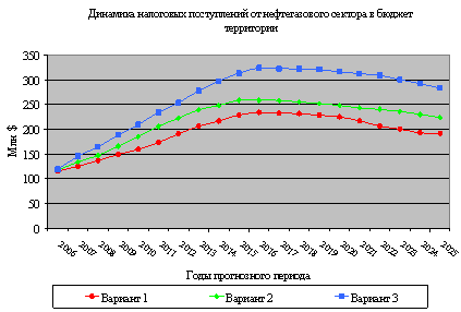 Анализ динамики и состава налоговых поступлений от нефтегазового сектора в региональный бюджет в рамках производственного сценария позволяет сделать вывод о том, что в условиях неизменной системы налогообложения и межбюджетных отношений в период 2006-2025 динамика налоговых платежей нефтегазового сектора коррелируется с динамикой добычи нефти по прогнозным вариантам, то есть рост налоговых доходов НАО напрямую связан с увеличением объемов производства и повышением показателей эффективности работы нефтегазодобывающих предприятий (особенно в третьем варианте прогноза) (рис.7).
