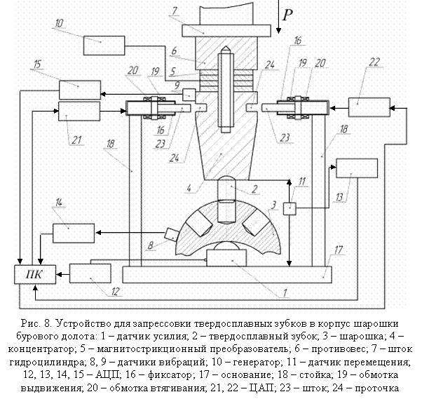 Основой схемы технологического оборудования явилась запатентованная модель устройства для запрессовки твердосплавных зубков в корпус шарошки бурового долота с оперативной диагностикой качества формируемого соединения по динамическим характеристикам механической колебательной системы (рис. 8).
