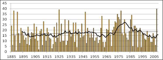 Рис. 4. Число оттепелей за холодный период (м/с Архангельск)