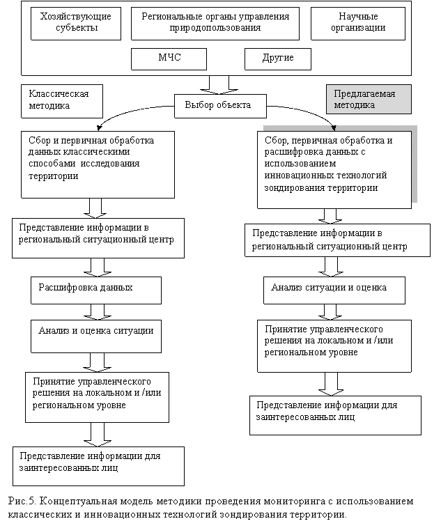 Комплексная методика мониторинга социально-экономического развития региона формализована в виде модели, которая описывает деятельность основных участников процесса мониторинга на региональном уровне, а также способы взаимодействия между ними и определяет место инновационных технологий зондирования территории в данном процессе. Агрегированный вид модели проведения мониторинга представлен на рис.5.