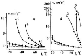 Кинематическую вязкость композиций (n) измеряли в соответствии с ГОСТ 33-82 при 20 - 80 оС. Использованы вискозиметры типа ВПЖ. Точность термостатирования 0,1 С. Величину загущающего эффекта оценивали как разность между кинематической вязкостью композиции nк и растворителя-основы nо в изотермических условиях: Dn = nк - nо. Реологические свойства составов в том же температурном интервале изучены с помощью вискозиметра Уббелоде. На основании полученных данных строили кривые течения в координатах (1/t) - f (P), где t- время истечения жидкости через капилляр, Р - разность давлений на концах капилляра вискозиметра.