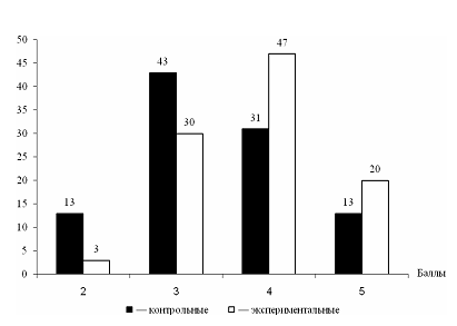 Для оценки уровня формирования профессиональной компетентнонсти использовались и другие параметры. Было проведено специальное анкетирование, где сформированность каждой из четырех групп приведенных компетенций анализировалась отдельно. Анкеты содержали пять вопросов по соответствующей группе компетенций. За каждый правильный и полный ответ ставилось два балла. Максимальное количество баллов по каждой группе компетенций равнялось 10, по методической подготовке в целом Ч 40 баллам. В табл. 5 приведены средние баллы по четырем группам компетенций в контрольных и экспериментальных учебных группах.