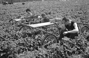 Второе направление - сбор ягод с применением тележек и платформ,а которые можно разделить на три класса: перекатываемые самим сборщиком, перемещаемые по плантации с помощью трактора и самоходные.