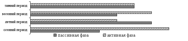 Отношение активной фазы к пассивной составляло 1,0 ед - в зимний период, 1,4 ед - в весенний период, 0,71 ед. - в летний период и 2,0 ед. - осенью.