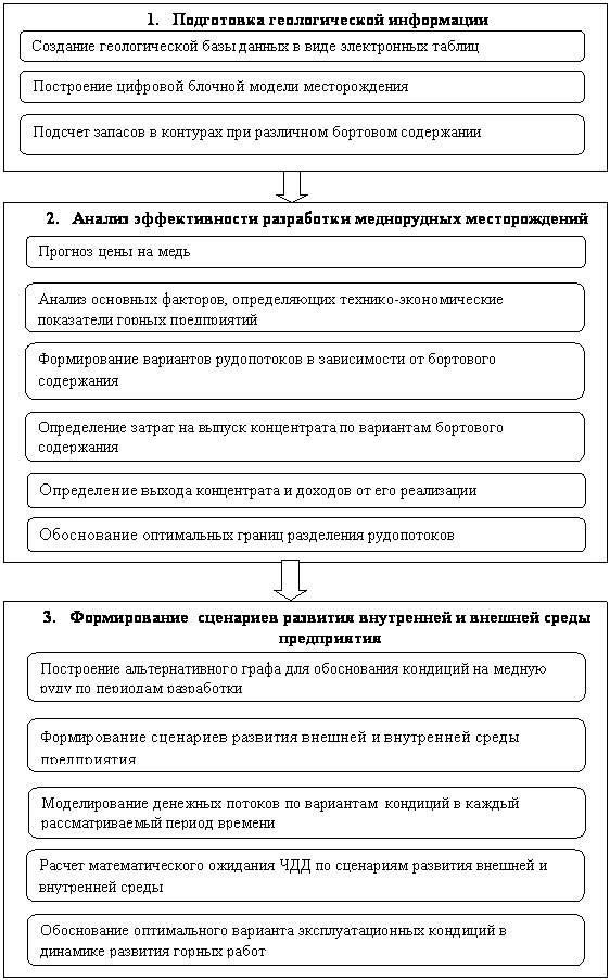- Для экономического обоснования эксплуатационных кондиций и параметров рудопотоков следует использоватьа процедуру, включающую прогноз цены на медь, анализ затрат на выпуск концентрата по вариантам бортового содержания, определение выхода концентрата и доходов от его реализации, моделирование денежных потоков при различных сценариях развития внешней и внутренней среды и оптимизацию пути альтернативного графа по критерию максимизации математического ожидания прибыли на основе подхода динамического программирования.