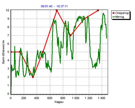3. Предложено решение проблемы автоматического определения балла облачности, как одного из признаков, участвующих в классификации. Полученные результаты автоматического определения балла облачности в большинстве случаев удовлетворительно согласуются с синоптическими данными.