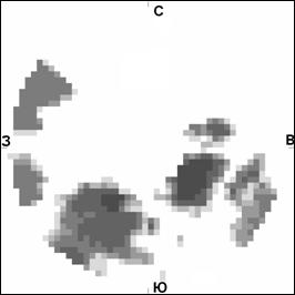 Также определялись признаки связности облаков и просветов. Они вычисляются по черно-белым (бинарным) изображениям, полученным на основе коэффициента покрытия (балла облачности) (рис. 3). Ячейки одного типа, связанные по горизонтали или вертикали, принадлежат одному облаку, или просвету, в противном случае - к разным. Таким образом, мы получаем количество облаков и количество просветов. Затем определяется связность облаков и просветов на основе распределения их размеров и средних значений.