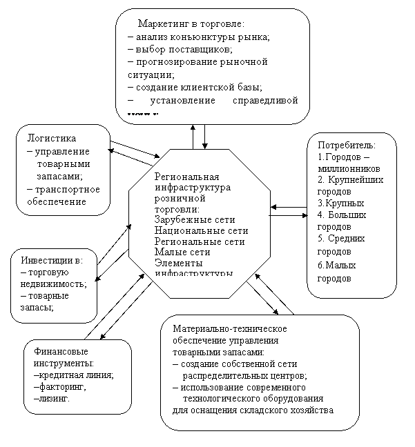 Еще более возрастает роль маркетинга при определении новых приоритетов в размещении торговли, обосновании стратегий развития инфраструктурных форматов, которые значительно изменились с включением регионов в систему межгосударственного товарообмена. Анализ зарубежной и отечественной литературы свидетельствует, в частности, что маркетинговый подход в формировании современных институтов сферы обращения в целом в регионах используется для решения ряда проблем, связанных с децентрализацией торговли, созданием её полноценного, многоформатного комплекса. Любая хозяйственная специализация региона априори предполагает необходимость последующего обмена созданными продуктами, а пространственное разделение требует наличия условий для процессов обмена, в том числе перемещения, хранения и подготовки к продаже, что обусловливает необходимость предоставления услуг, установления связи и коммуникационного обеспечения, что и достигается на основе комплексного развития инфраструктуры торговли.