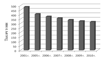 Данные, представление на рисунке, позволяют сделать вывод о том, что объем производства хлеба и хлебобулочных изделий за последние десять лет уменьшился в 1,5 раза, и в 2010 году составлял 317,7 тыс. т. В настоящее время, ассортимент продукции, вырабатываемой хлебопекарными предприятиями Краснодарского края, по разным оценкам составляет от 600 до 800 наименований. При этом около 80% занимают массовые сорта хлеба из пшеничной, ржаной и смеси ржаной и пшеничной муки. Наряду с массовыми сортами хлеба предприятий края выпускают продукцию лечебно-профилактического назначения с обогащенными йодом, отрубями, злаковыми смесями.