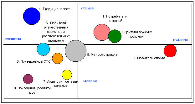 Положение круга, соответствующего группе, определяется средними значениями пола и возраста зрителей, принадлежащих к этой группе. Размер круга зависит от величины группы. Точка пересечения координатных осей соответствует средним значениям пола и возраста для телеаудитории в целом.