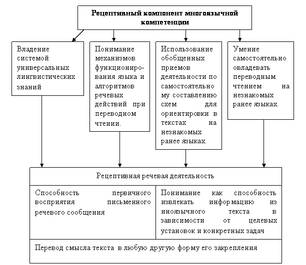 - в основе формирования многоязычной компетенции лежит развитие рецептивного компонента (рецептивной компетенции), акоторый определяется как способность к осознанному восприятию иа пониманию иноязычных текстов на основе выявления общего и особенного в различных, включая родной, ааязыках, основанная на алингвистической концепции глубинных и поверхностных структур;а