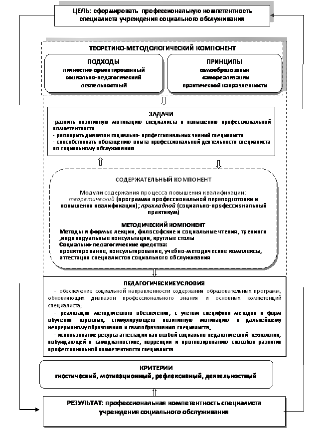 - Процессуальная модель развития профессиональной компетентности специалиста учреждения социального обслуживания, сконструированная на основе личностно-ориентированного, социально-педагогического, деятельностного подходов, является действенной технологической основой, отражая взаимосвязи и совокупность структурных компонентов: целевого (повышение уровня профессиональной компетентности специалиста), теоретико-методологического (основные подходы и принципы самообразования, самореализации, практической направленности), содержательного (модули содержания непрерывного образования: теоретический (программа профессиональной переподготовки и повышения квалификации); прикладной (социально-профессиональный практикум); и этапы: аналитико-диагностический, организационно-координирующий, формирующий), методического (основные социально-педагогические средства: проектирование, консультирование, учебно-методические комплексы, аттестация специалистов социального обслуживания; методы и формы); результативно-оценочного (критерии и показатели - гностический, мотивационный, рефлексивный, деятельностный); педагогические условия, обеспечивающие эффективность процесса развития профессиональной компетентности специалиста учреждения социального обслуживания.