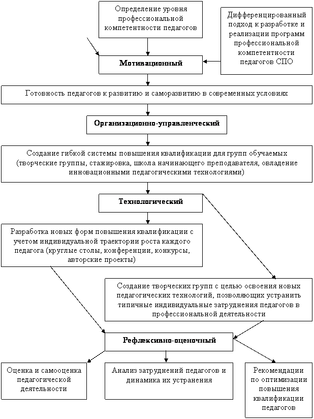 - освоение педагогических технологий рассматривать как условие развития педагогической деятельности и повышения профессиональной компетентности работников СПО, на основе учета содержательного, организационного и мотивационного аспектов;