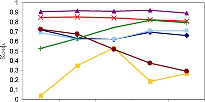 Исходя из данного алгоритма, значения интегральных коэффициентов определены по каждой группе, отражающих технологические и конкурентные состояния предприятий.