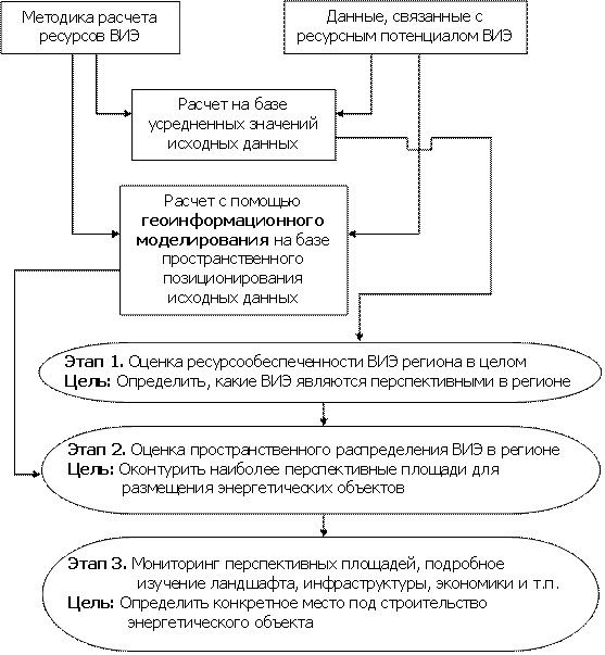 Существующие методы оценки потенциала ресурсов ВИЭ без применения геоинформационных технологий позволяют получать точечные результаты либо на основе данных для исследуемой площадки, либо на основе усредненных данных для какой либо территории (города, района, республики или страны в целом). Результаты таких расчетов отражены в многочисленных справочниках. Они дают общую оценку наличия ресурсного потенциала ВИЭ. Такая оценка важна с точки зрения определения энергетических перспектив региона, и дает ответ на вопрос: лесть ли смысл развивать тот или иной сектор нетрадиционной энергетики?. Однако, ответа на вопрос: где конкретно следует разместить энергетические установки для достижения максимального экономического и экологического эффекта? из справочников получить не возможно.