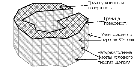 Для генерации геометрических примитивов слоеногоа пирога трехмерного поля необходимо определить границу триангуляционной поверхности (рис.5). Алгоритм определения границы триангуляционной поверхности должен быть максимально эффективен с точки зрения скорости выполнения, поскольку он используется в реальном времени каждый раз при визуализации модели. Задача определения границы триангуляционной поверхности ставится следующим образом. Имеется массив из n узлов триангуляционной поверхности (x0, y0, z0), (x1, y1, z1), (x2, y2, z2),Е, (xn-1, yn-1, zn-1) и m фасетов (i00, i10, i20), (i01, i11, i21), (i02, i12, i22), Е, (i0m-1, i1m-1, i2m-1), где i0, i1, i2 - ссылки на узлы - порядковые номера из массива узлов. Необходимо найти все k граничных ребер триангуляционной поверхности (F0, S0), (F1, S1), (F2, S2),Е, (Fk-1, Sk-1), где F и S ссылки на начальный и конечный узлы ребра. Все найденные граничные ребра и будут представлять собой граничный контур триангуляционной поверхности. В любом случае решение задачи предполагает рассмотрениеа всех фасет триангуляционной поверхности. Если решать задачу очевидным образом, то алгоритм ее решения будет следующим: 1) на основе перебора всех треугольных фасет получаем массив всех ребер, 2) перебирая все ребра, выбираем несмежные, причем для проверки смежности ребра необходимо пройти по остальным, еще не обработанным ребрам. При большом количестве фасетов в триангуляционной поверхности такой алгоритм может существенно замедлять процесс подготовки модели к визуализации.