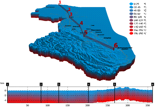 - С использованием разработанных геоинформационных технологий построены модели: а) трехмерного геологического строения земной коры Дагестана, б) трехмерного температурного поля до 5000м. Данные модели являютсяа основой расчета пространственного распределения плотности геотермальных ресурсов.
