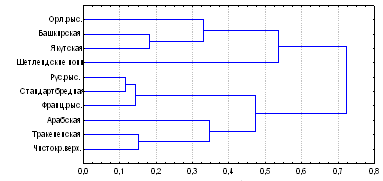 Рис. 2. Дендрограмма генетических дистанций между породами лошадей по локусам полиморфных систем крови.