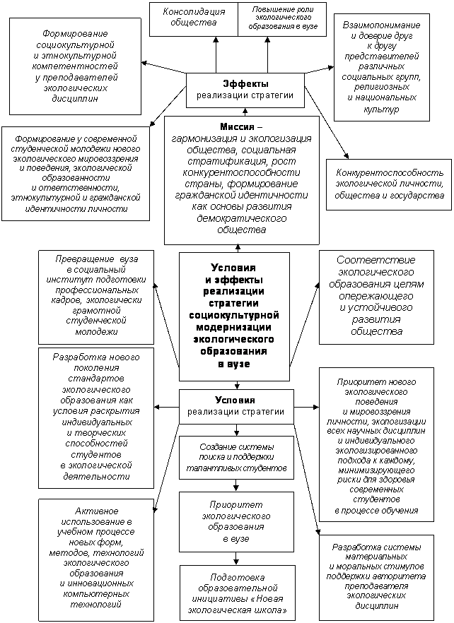 3. Стратегия социокультурной модернизации экологического образования в вузе, педагогические условия, эффекты и механизмы ее реализации. Миссией стратегии социокультурной модернизации экологического образования в вузе является реализация общенациональной идеологии и политики, позволяющей достичь таких системных социальных и ментальных эффектов, как гармонизация общества, социальная стратификация, рост конкурентоспособности страны, формирование гражданской идентичности - - основы развития демократического общества. В контексте подобной программы экологическое образование в вузе выступает в качестве ведущей социальной деятельности, порождающей гражданскую идентичность и формирующей менталитет народа, ценности, социальные нормы поведения личности.