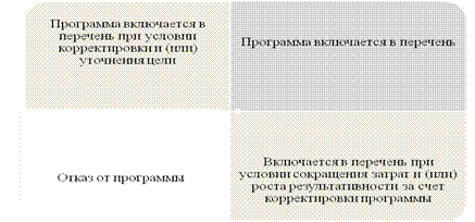 На рис. 3 видно, что если у программы высокая целевая и экономическая эффективность, ее реализацию целесообразно продолжать (при условии, что цель, достигаемая в результате реализации программы, сохраняет свою актуальность). Напротив, если программа характеризуется низкими показателями в экономической и целевойа эффективности, продолжение ее реализации нецелесообразно.