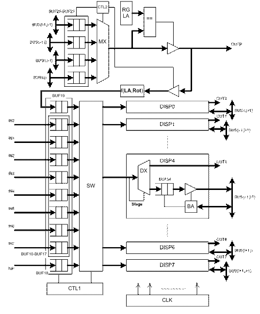 BUFxy - FIFO-буферы; SW - коммутатор; f(LA,Rot) - схема вычисления логического адреса следующего приемника; DISP0-DISP7 - блоки диспетчеризации сообщений; BA - шинный арбитр; RGLA - регистр логического адреса модуля; CTL1, CTL2 - блоки управления; CLK - блок синхронизации