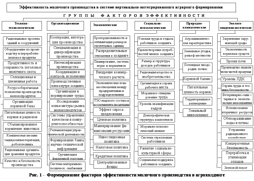 В авторской разработке классификации факторов повышения эффективности молочного производства на предприятиях корпоративного типа, как более высокой ступени организации производства, наиболее полно сформированы следующие направления действия факторов: технико-технологические, организационные, экономические, социально-экономические, природно-климатические и эколого-эпидемиологические (рис.1). К специфическим факторам, свойственным агрохолдингам, отнесены маневрирование трудовыми и финансовыми ресурсами, распределительные отношения, координация иа контроль исполнения, характер производственных связей между предприятиями холдинга, сочетание форм специализации и диверсификации производства в соответствии с рыночной ситуацией, усиление воздействия централизованных фондов. Рациональное сочетание приведенных факторов в конкретных условиях определяет выбор организационных и производственных мероприятий, инноваций и инвестиций, международных отношений, их эффективное функционирование.