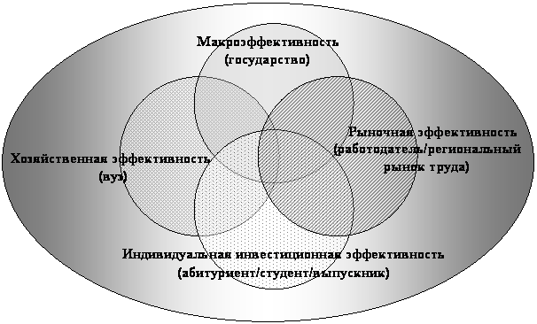 С точки зрения государства, экономическая эффективность высшего образования в первую очередь представляет собой более высокую отдачу от вложения бюджетных средств в образование, чем от вложений в другие сферы экономики при условии снижения потерь от государственного перераспределения средств бюджета в пользу образования. Социальная эффективность высшего образования на государственном уровне проявляется в социальной стабилизации общества и в общем повышении уровня жизни населения. Экономическая эффективность в масштабах национальной экономики определяется изменением качества трудового и научного потенциала, ростом производительности труда и, в конечном счете, ростом ВВП. На рынке образовательных услуг проявляется эффективность управления и функционирования высшего учебного заведения в форме его конкурентоспособности и общего положения на рынке. В данном случае уместнее говорить об экономической эффективности, хотя и не в полной мере коммерческого понимания данного термина, поскольку получение прибыли для вуза не является самоцелью. Определяющими экономическую эффективность показателями в данном случае являются объем совокупного (бюджетного и внебюджетного) дохода, уровень затрат, а также структура расходов вуза, раскрывающая его реальные возможности и конкурентную устойчивость. С позиций регионального рынка труда можно говорить о социальной эффективности высшего образования при наличии положительной динамики показателей занятости и безработицы, в том числе молодых специалистов, экономическая же эффективность определяется скорее на уровне региональной экономики в целом ростом показателей производительности труда и ВРП. Экономическая эффективность высшего образования для работодателя - это, в первую очередь, разница между предельным доходом, получаемым предприятием в результате найма соответствующего специалиста, и затратами на его подготовку и оплату его труда. В отношении индивидуума об эффективности высшего профессионального образования, как уже было отмечено выше, можно говорить в двух направлениях: экономическая эффективность вложений в образование с учетом так называемых издержек упущенных возможностей и социальная эффективность в форме повышения образовательного, профессионального уровня и, как следствие, статусного положения в обществе.