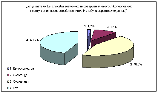 В пользу процесса исправления и развития личности осужденных, получающих ВО в ИУ, свидетельствуют их отрицательные ответы на вопрос о возможности совершения уголовного преступления в дальнейшем, в то время как осужденные, необучающиеся в данный момент, предполагают возможность совершения преступления (а некоторые в этом убеждены), что говорит об отсутствии у них социально приемлемых моделей и установок поведения.