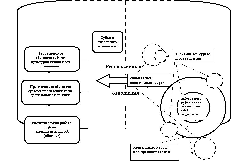 - Системным представлением рефлексивного диалога, синтезирующим традиционные системы вуза (отношения, опыт, знания), является модель, которая включает в себя такиеа компоненты образовательной системыаа как: виды обучения и соответствующие виды субъектности - теоретическое обучение (субъект культурноЦценностных отношений), практическое обучение (субъект профессиональноЦдеятельностных отношений),а воспитательная работаа (субъект индивидуальноЦличностных отношений) - с одной стороны, и с другой -а педагогические условия рефлексивного диалога в вузе,аа рефлексивно-психологическойа поддержки развития студентов и преподавателей.