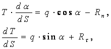 В уравнении (6) приняты следующие обозначения: S- длина сети, Т- усилие в сети, ?- угол между направлением Т и горизонталью, q- вес сети в воде,Rn- нормальная составляющая полной гидродинамической силы в связанной системе координат, вычисляется по следующей формуле: