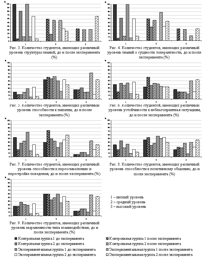 После эксперимента увеличилось количество студентов, показывающих средний и высокий уровень структуры и уровня знаний о сущности толерантности, и сократилось количество студентов имеющих низкие значения структуры и уровня знаний о сущности толерантности. Изменения в уровне сформированности данного показателя произошли как в контрольных группах, так и в экспериментальных группах (р?0,05). Значимость сдвигов показателей свидетельствует о том, что студенты, как контрольных, так и экспериментальных групп усвоили знания о сущности толерантности.