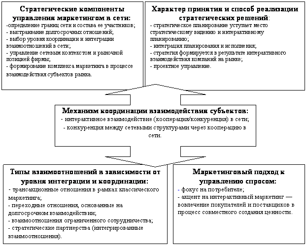 Сетевой подход в промышленном маркетинге является методологией исследования и управления межфирменными отношениями, основанными на социальной и экономической близости партнеров. Межфирменные сети как способ регулирования взаимозависимости между компаниями преодолевают недостатки рыночного и административного механизмов, обеспечивая согласованное принятие решений и сотрудничество при сохранении децентрализованной системы управления.