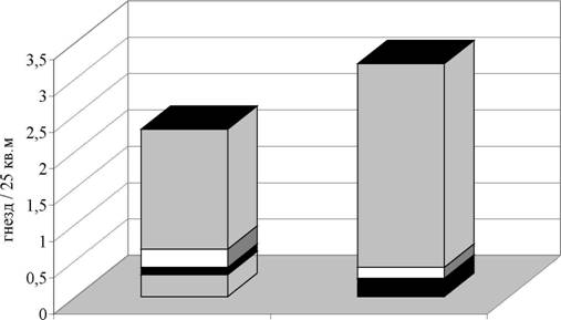 Необходимо подчеркнуть, что в среднем, 89,1 % всех найденных гнезд L.nigerв городе расположено подземно, а в контроле - только 20 %. Процентное соотношение различных типов гнезд L. nigerможет выступать еще одним индикационным показателем.