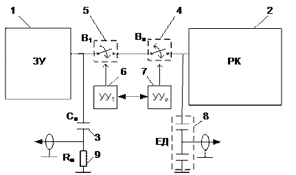 Рис.3. Принципиальная схема испытательной установки: 1 - зарядное устройство, 2 - разрядный контур, 3 - батарея конденсаторов, 4 - испытуемый вакуумный выключатель, 5 - вспомогательный вакуумный выключатель, 6 - устройство управления вспомогательным выключателем, 7 - устройство управления испытуемым выключателем, 8 - емкостный делитель напряжения, 9 - измерительный резистивный шунт |
