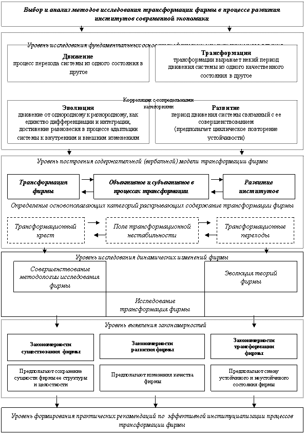 Цели и задачи исследования. Цель исследования состоит в выявлении закономерностей трансформаций фирм в процессе развития институтов современной экономики, обосновании методологических основ, теоретических положений и практических рекомендаций по эффективной институционализации трансформационных процессов. Достижение поставленной цели обусловило постановку следующих основных задач исследования:
