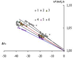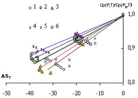 - Для расчета теплопроводности исследуемых объектов рекомендовано применение уравнения Тейта. Обобщение полученных данных по теплоемкости и теплопроводности на основе метода подобия процессов молекулярного переноса позволило получить зависимости относительного изменения СР/СР0 =f(P,T) и ?/?0=f(P,T) от приращения энтропии в широкой области изменения температур и давлений. Обобщенные зависимости аппроксимированы в виде уравнений (5.2.6) и (5.2.7), позволяющих рассчитывать СР=f(P,T) и ?=f(P,T) при давлениях до 49МПа и температурах до 623К с погрешностью соответственно 3% и 2%.