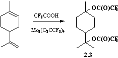 В противоположность ожидаемому, нами найдено, что в результате взаимодействия трифторуксусной кислоты с лимоненом в толуоле при комнатной температуре в присутствии трифторацетата молибдена (0.1 моль на 1 моль лимонена) в качестве практически единственного продукта образунется бистрифторацетат терпина (2.3).