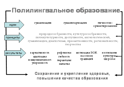 - разработка структурной модели здоровьеразвивающего регионального образовательного пространства, содержательно-смысловой основой которой является полилингвальное образование, обеспечивающее выбор языка обучения в зависимости от степени владения языком; при этом для учащихся младших классов национальных школ создаются максимально комфортные условия для паритетного билингвального обучения в соответствии с их психофизиологическими особенностями, тем самым формируя у них валеологически целесообразный стереотип культуры здоровья.