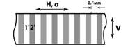 Рис.1. Схематичное изображение структуры ленты, прошедшей лазерную обработку. а - направление движения лазерного луча параллельно оси прокатки ленты, б - направление движения лазерного луча перпендикулярно оси прокатки ленты. 1- необработанные участки, 2 - участки, подвергнутые лазерной обработке. |