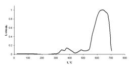 Рис.5. Зависимость интенсивности I экзоэлектронной эмиссии от температуры Т при линейном отжиге ленты состава Fe64Co21B15 (скорость нагрева 200С/мин). |