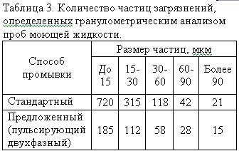 Экспериментальная апробация пульсирующего флотационного метода по сравнению с широко применяемым на данный момент методом промывки прокачкой однофазной жидкости, показывает, что флотационный метод обладает значительным преимуществом. Пример стенда представлен на рис. 18. В частности, количество частиц загрязнения при двухфазной промывке за одинаковое время (40 мин) вымывается больше, что представлено в статье Совершенствование технологии промывки гидравлических систем В.А. Стенина и В.Г. Дронделя (Технология машиностроения. 2008, №3, с 43-44) и показано в табл 3.